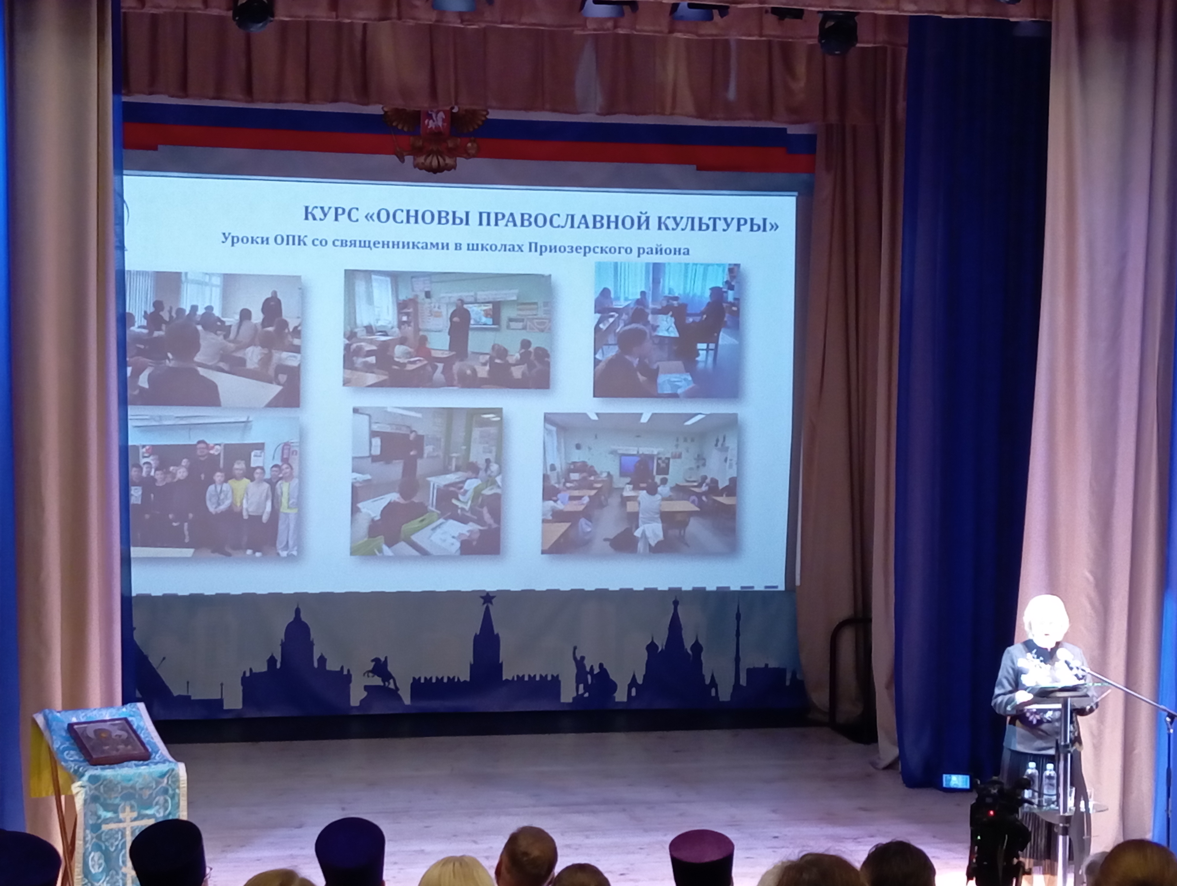 Гостей приветствовали: Митрополит Санкт-Петербургского и Ладожского Варсонофия; председатель Комитета по местному самоуправлению, межнациональным и межконфессиональным отношениям Ленинградской области Клементьева Андрея Геннадьевича, заместитель главы администрации Приозерского муниципального района по социальным вопросам и внутренней политике Кириллова Ирина Михайловна.